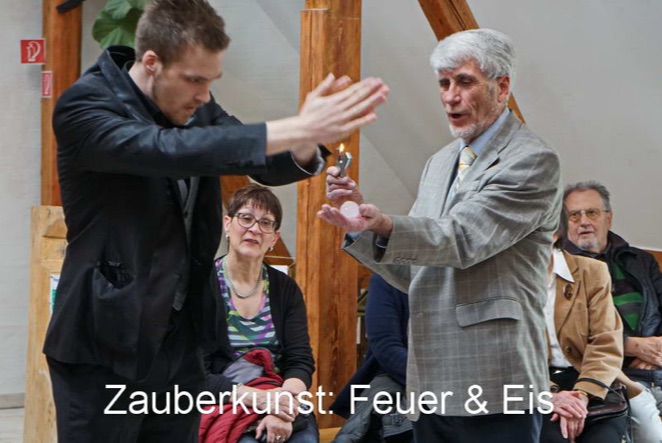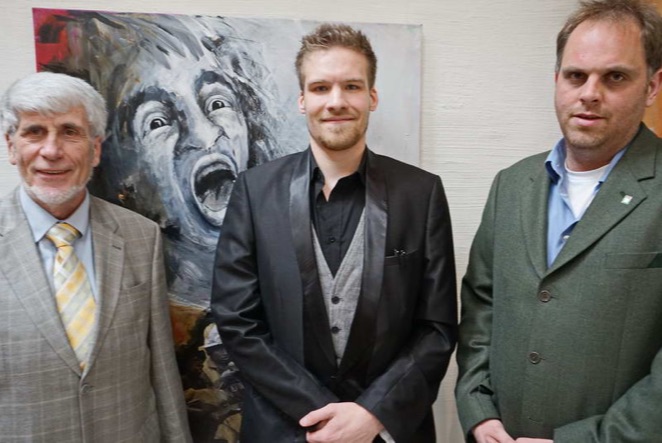 Gruppenfoto: (v.l.) Dr. Wolfgang Daum (Vorsitzender des Kulturvereins ARTD Driburg), Zauberkünstler David Wedegärtner (Das Spiel mit Feuer & Eis verzauberte die vielen Gäste der Vernissage), Jan Preller (Leiter des Waldinformationszentrums Hammerhof in Warburg Scherfede)