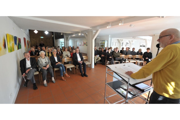 Noch vor der ersten Handbewegung der Künstlerin Kornelia Kopriva stehe das Sehen oder Erschauen, das Wissen oder Ahnen, das Spüren dessen, was zu sehen sein wird, beschrieb Dr. Michael Jähne in seinem einführenden Vortrag weiter den Werkprozess. Ein visueller Impuls werde aufgenommen und ein „Kondensationskern“ gelegt, um den herum etwas entstehen, sich bilden wird. Sehbares verdichte sich zu einem komplexen Gebilde, zu einem „Schau-Stück“.